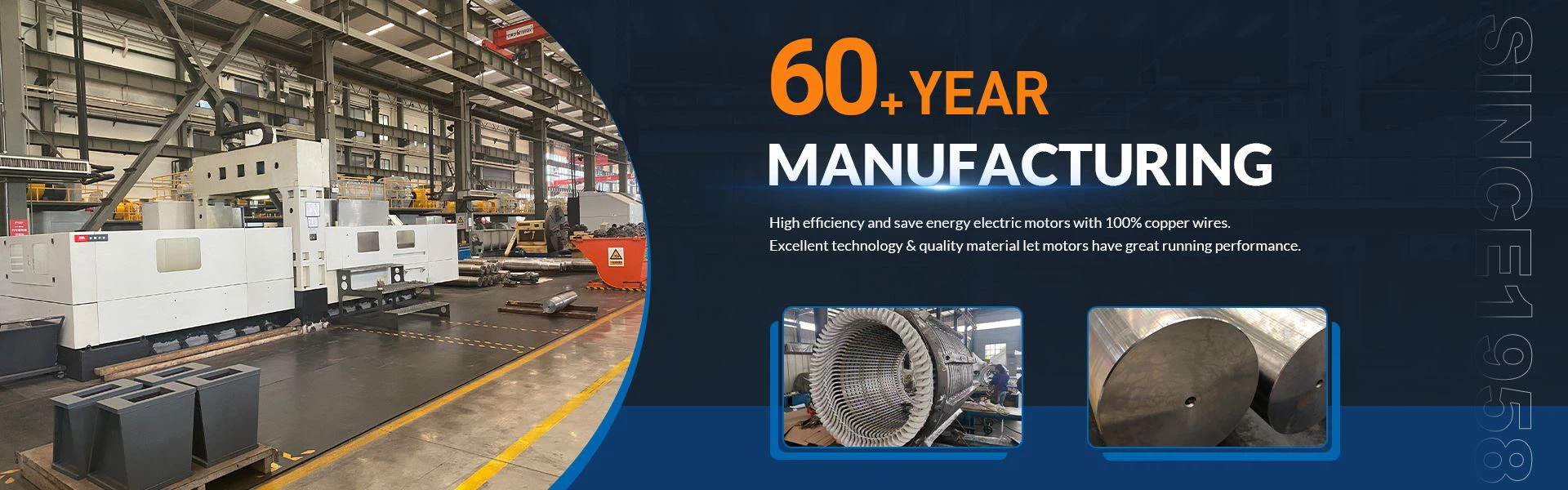 Proizvajalec električnih motorjev Wingo Star je bil ustanovljen leta 1958. Naša tovarna pokriva površino več kot 260,000 kvadratnih metrov, načrtovanje in proizvodna zmogljivost lahko dosežeta 5 milijonov KW. Paleta izdelkov: AC motorji, DC motorji, sinhroni motorji, Ex-proof motorji, Permanent Magic motorji, Generatorji itd.